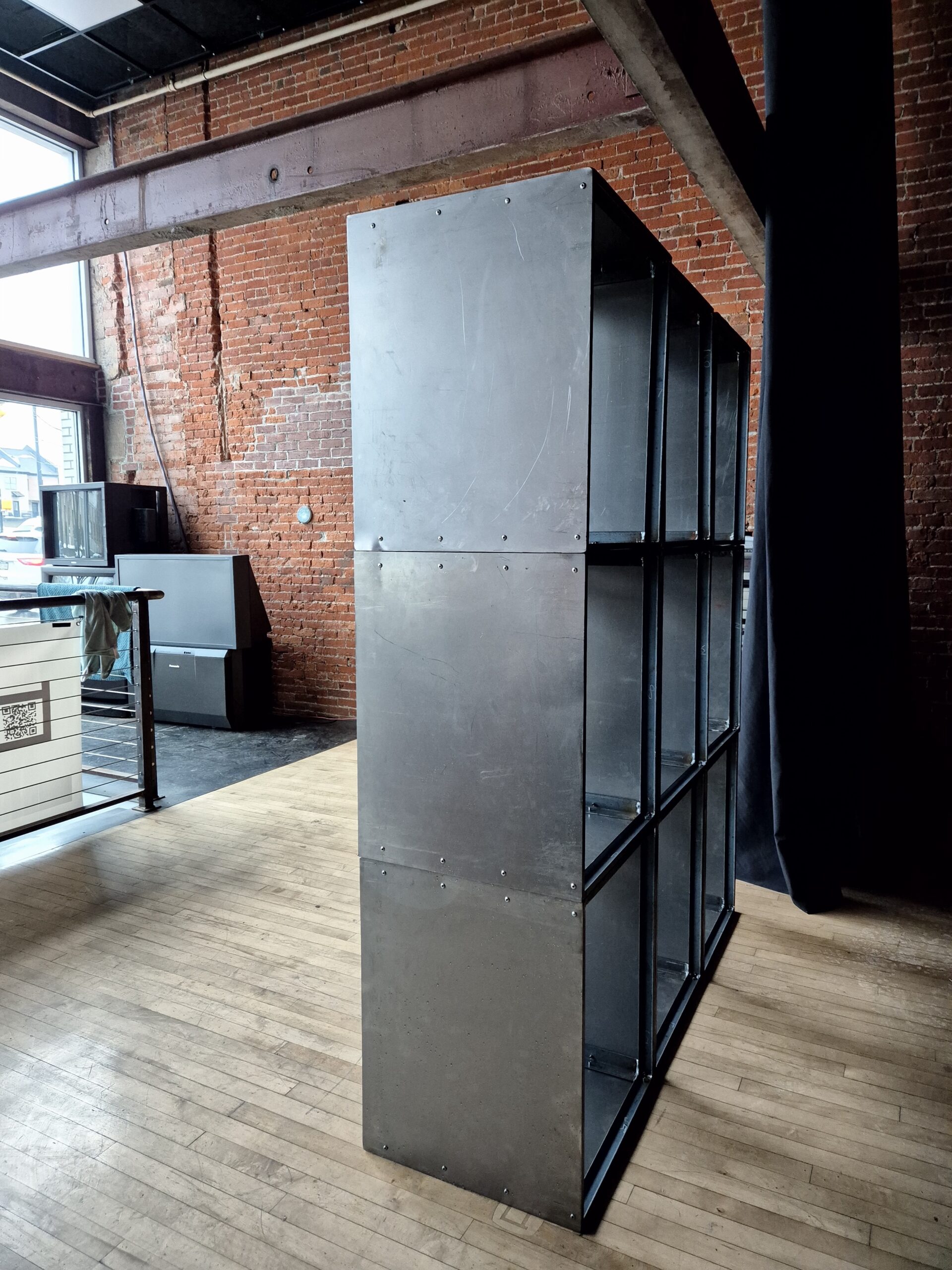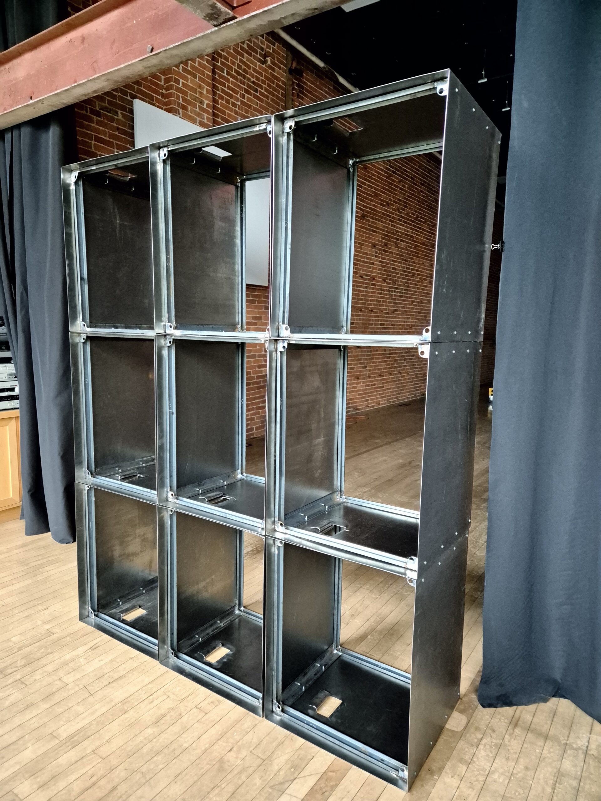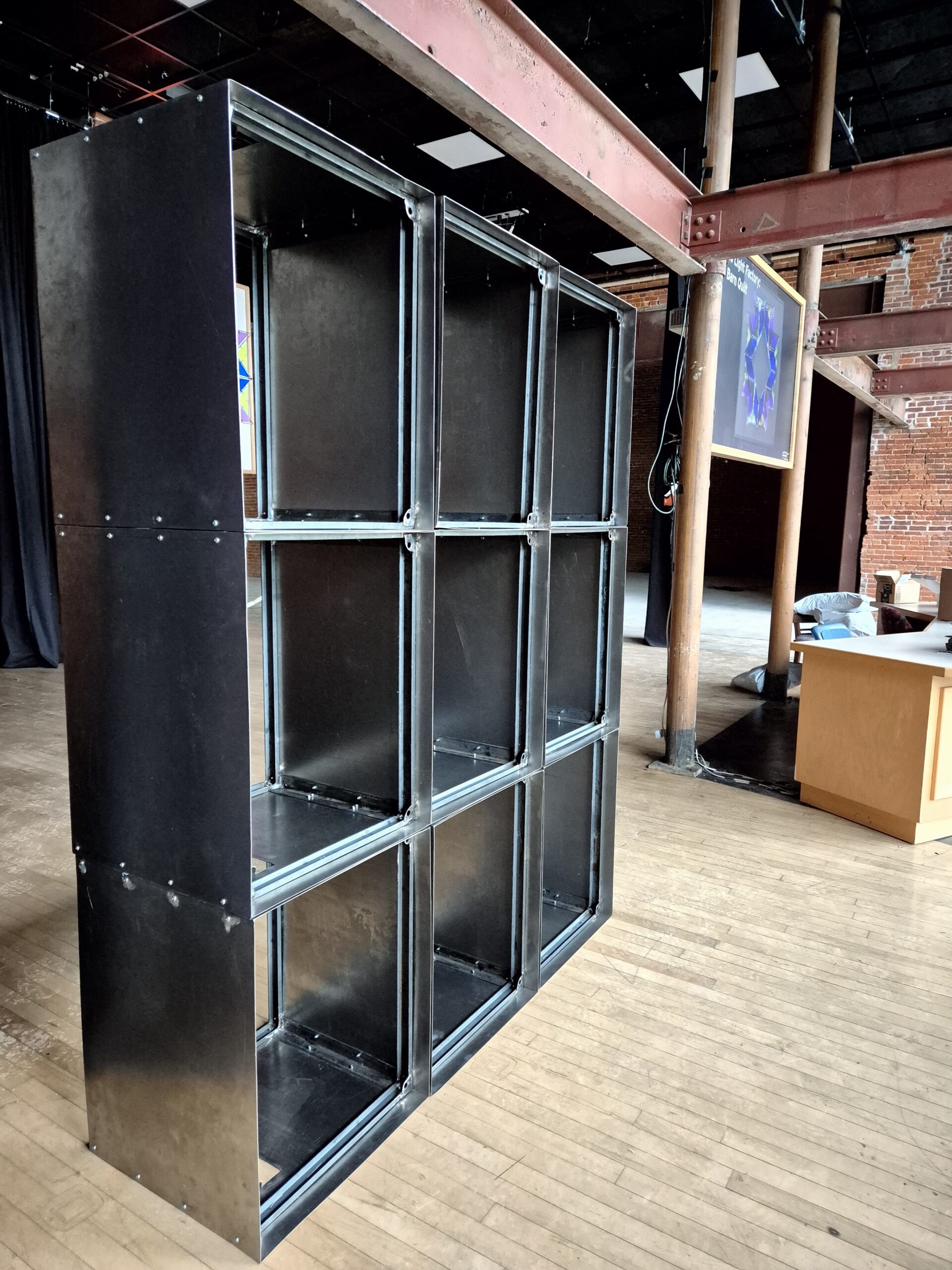 This work is a Videowall build designed and constructed by Nathaniel for FEED Media Art Center in Erie, Pennsylvania.The concept was to take 27″ Cathode Ray Tubes (old style tube TV’s), and fit them into a new body; where each individual TV tube is mounted to its own individual steel case.  Each of these cases can be reconfigured to make custom stacks of “TVwalls/Videowalls”, or they can act as independent pieces to showcase New Media Art and Film in a museum style setting.  This specific configuration is a 9×9 array stacked in “portrait” (where the height is greater than the width, in contrast to “panoramic”, where the width dominates as in a cinema screen).  Multiple alternate design/look/frame single unit boxes also exist, and are in use, in this series.