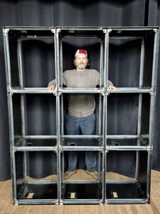 This work is a Videowall build designed and constructed by Nathaniel for FEED Media Art Center in Erie, Pennsylvania.The concept was to take 27″ Cathode Ray Tubes (old style tube TV’s), and fit them into a new body; where each individual TV tube is mounted to its own individual steel case. Each of these cases can be reconfigured to make custom stacks of “TVwalls/Videowalls”, or they can act as independent pieces to showcase New Media Art and Film in a museum style setting. This specific configuration is a 9×9 array stacked in “portrait” (where the height is greater than the width, in contrast to “panoramic”, where the width dominates as in a cinema screen). Multiple alternate design/look/frame single unit boxes also exist, and are in use, in this series.